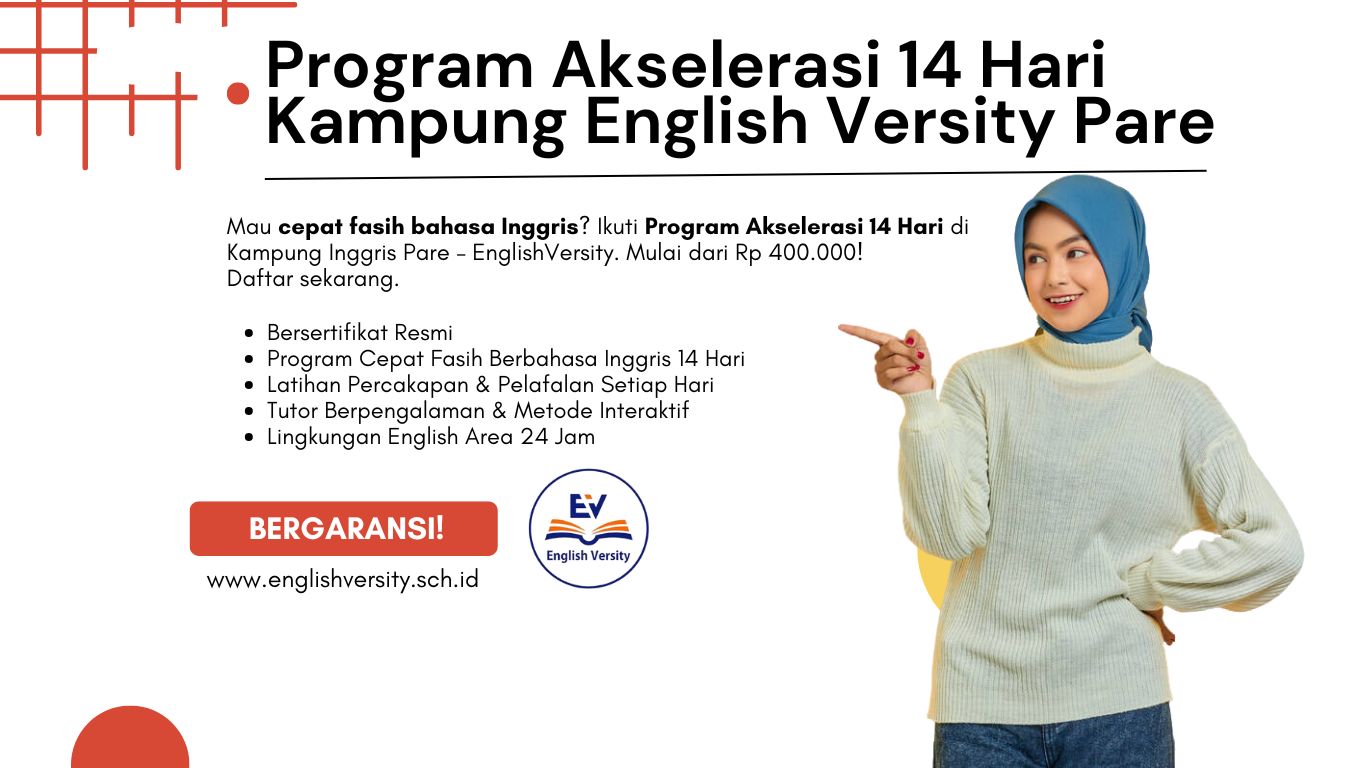 Kampung English Versity Pare resmi menawarkan program kursus akselerasi 14 hari bagi siapa saja yang ingin cepat fasih berbicara bahasa Inggris. Program ini dirancang khusus dengan metode intensif untuk membantu Anda berbicara lancar, percaya diri, dan memahami struktur grammar dengan efektif.